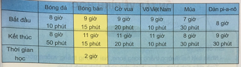Điền số đo thời gian thích hợp vào ô trống trong bảng thời gian biểu ở câu lạc bộ dưới đây (theo mẫu):
