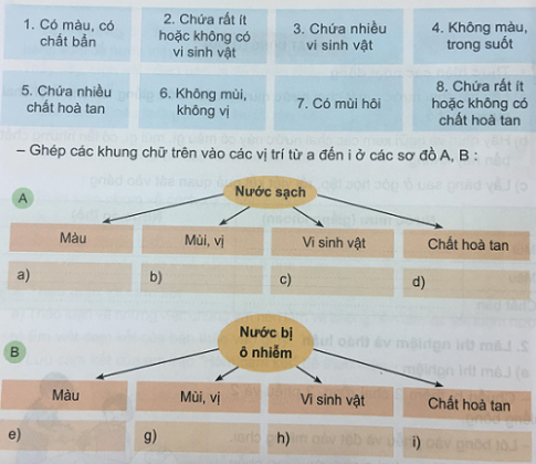 Đọc kĩ các khung chữ từ 1 đến 8 dưới đây, ghép khung chữ trên vào các vị trí từ a đến i ở các sơ đồ A, B.