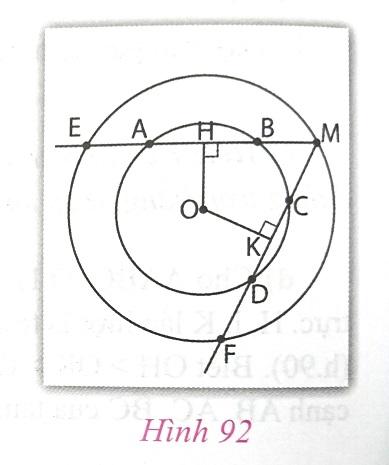 Cho hình 92, trong đó hai đường tròn cùng có tâm O. Cho biết AB > CD. Hãy so sánh các độ dài:
