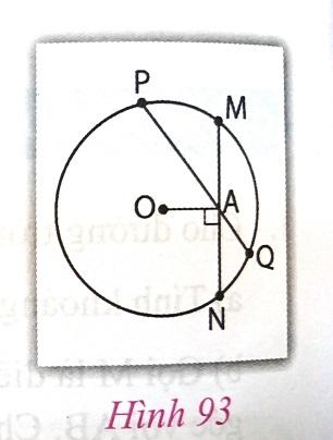 Cho đường tròn (O), điểm A nằm trong đường tròn. Vẽ dây MN vuông góc với OA tại A. Vẽ dây PQ bất kì đi qua A và không vuông góc với OA. Hãy so sánh độ dài hai dây MN và PQ (h.93)