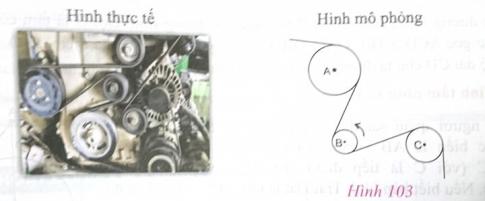 Đố: Dây cu-roa trên hình 103 có những phần là tiếp tuyến của các đường tròn tâm A, B, C. Chiều quay của đường tròn tâm B ngược chiều quay của kim đồng hồ. Tìm chiều quay của đường tròn tâm A và đường tròn tâm C (cùng chiều quay hay ngược chiều quay của kim đồng hồ)