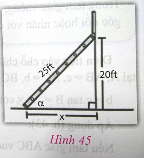 Foot (viết tắt là ft) là một đơn vị đo độ dài được sư dụng phổ biến ở các nước nói tiếng Anh: 1 foot = 0,3048m. Một người lính cứu hỏa dựng một chiếc thang dài 25ft dựa vào một bức tường theo một góc $\alpha $. Biết đỉnh của chiếc thang cách mặt đất 20ft. Tính khoảng cách x từ chân thang đến chân tường và góc $\alpha $ (h.45).