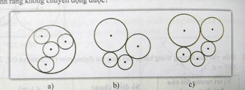 Đố: Trên các hình 128a, 128b, 128c, các bánh xe tròn có răng cưa được khớp với nhau. Trên hình nào hệ thống bánh răng chuyển động được? Trên hình nào hệ thống bánh răng không chuyển động được?