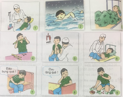 - Sắp xếp 9 hình trên thành ba câu chuyện, mỗi câu chuyện gồm 3 hình thể hiện bạn nam lúc khỏe mạnh, khi bị bệnh và lúc được khám bệnh?