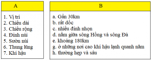 Ghép 1 từ ở cột A với một cụm từ thích hợp ở cột B để nói về đặc điểm của dãy Hoàng Liên Sơn