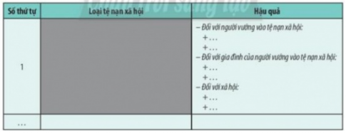 Câu 1. Em hãy lập bảng liệt kê tác hại của tệ nạn xã hội mà em biết. Từ đó, rút ra bài học để chia sẻ cùng bạn nhằm tránh xa tệ nạn xã hội.