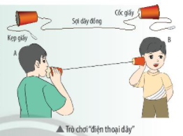 Dùng hai cốc giấy đục một lỗ nhỏ giữa đáy cốc, rồi luồn một sợi dây đồng mảnh (dài khoảng 3 đến 4m) qua lỗ nối hai cốc giấy với nhau như hình bên. Học sinh B áp tai vào cốc giấy lắng nghe, trong khi bạn A đang nói nhỏ vào miệng cốc.