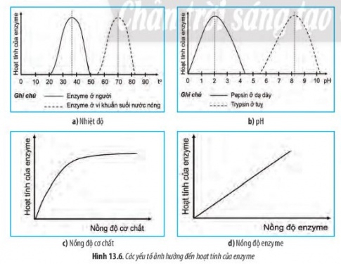 Câu hỏi 11: Quan sát các đồ thị trong Hình 13.6, hãy rút ra nhận xét về sự ảnh hưởng của các yếu tố đến hoạt tính của enzyme.