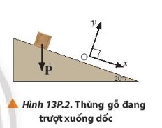 Bài tập 2: Một chiếc thùng gỗ khối lượng m đang trượt xuống từ một dốc nghiêng $20^{\circ}$ so với phương ngang. Em hãy phân tích thành phần vecto trọng lực tác dụng lên thùng gỗ theo các phương Ox và Oy