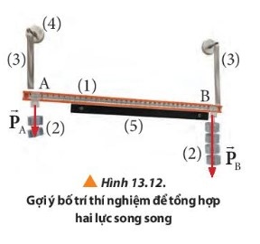 Câu hỏi 6: Đề xuất phương án xác định lực tổng hợp của hai lực song song với dụng cụ và cách bố trí được gợi ý trong bài.