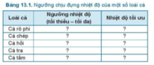 VD: Em hãy tìm hiểu ngưỡng chịu đựng nhiệt độ và nhiệt độ tối ưu của một số loài cá theo mẫu Bảng 13.1