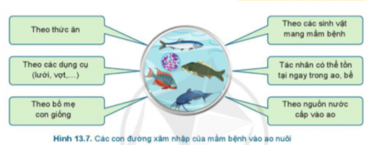 3. Quan sát Hình 13.7 và cho biết mầm bệnh có thể xâm nhập vào ao nuôi bằng những con đường nào?
