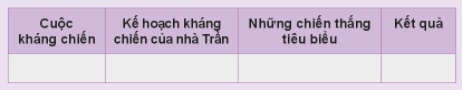 Câu 1. Hãy lập và hoàn thành bảng theo mẫu dưới đây về ba lần kháng chiến chống quân xâm lược Mông - Nguyên.