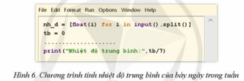 Bài 2. Bạn Thanh muốn tính trung bình cộng của nhiệt độ trung bình các ngày trong tuần. Thanh đã viết được đoạn chương trình nhập từ bàn phím nhiệt độ trung bình của bảy ngày trong tuần vào một danh sách (Hình 6)/ Em hãy giúp bạn Thanh viết tiếp những câu lệnh còn thiếu vào chỗ trống để máy tính đưa ra màn hình kết quả cần có.