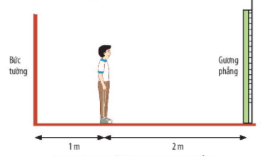 Câu hỏi 2. Hình dưới biểu diễn một học sinh đứng trước gương, cách gương 2m. Có một bức tường ở phía sau cách học sinh 1m. Ảnh của bức tường tạo bởi gương phẳng cách nơi học sinh đứng bao nhiêu mét?