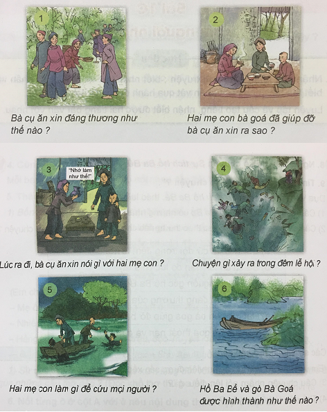Mồi bức tranh sau minh họa cho một sự việc của câu chuyện Sự tích hồ Ba Bể. Dựa vào tranh và trả lời câu hỏi dưới tranh, mỗi bạn kể lại một đoạn câu chuyện.