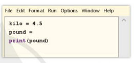 Bài 3. Em hãy hoàn thiện chương trình ở Hình 5 bằng cách viết biểu thức gán cho biến pound để nhận được chương trình chuyển đổi đơn vị đo khối lượng từ đơn vị ki-lô-gam sang pound, biết rằng 1 kg bằng 2,205 pound. Em hãy thay đổi giá trị gán cho biến kilo để chạy thử nghiệm chương trình.