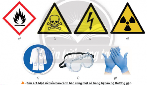 Luyện tập 1: Quan sát Hình 2.3, nêu ý nghĩa của mỗi biển báo cảnh báo và công dụng của mỗi trang thiết bị bảo hộ trong phòng thí nghiệm.