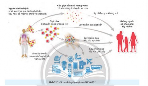 Luyện tập 2: Quan sát Hình 31.3, hãy phân tích khả năng lây truyền của virus trong không khí qua các giọt tiết.