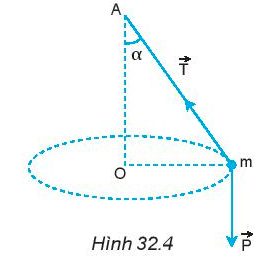 Vẽ hợp lực của lực căng dây $\overrightarrow{T}$ và trọng lực , từ đó xác định lực hướng tâm trong Hình 32.4.