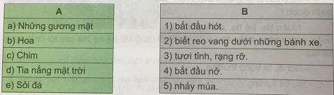 (3) Nối từ ngữ chỉ sự vật ở cột A với từ ngữ tả sự vật đó ở cột B để tạo thành các câu nói về sự thay đổi của vương quốc khi có tiếng cười: