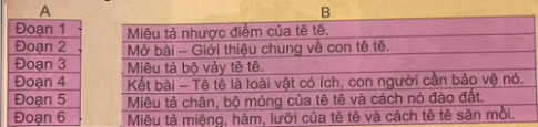 a. Nối từ Nối từ ngữ ở cột A với nội dung tương ứng ở cột B để có nội dung chính của các đoạn trong bài Con tê tê.