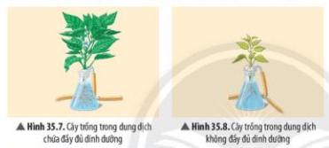 Câu hỏi 7. Quan sát Hình 35.7, 35.8, 35.9, cho biết sự khác nhau về hình thái giữa cây thiếu dinh dưỡng, cây thừa dinh dưỡng và cây đủ dinh dưỡng.
