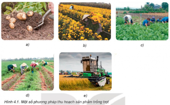 Khám phá: Quan sát Hình 4.1 và nêu các phương pháp thu hoạch sản phẩm trồng trọt ở mỗi hình a, b, c, d, e.
