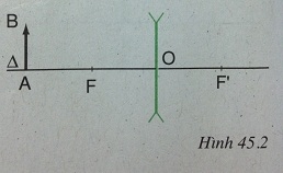 Trên hình 45.2 cho biết vật AB được đặt vuông góc với trục chính của thấu kính phân kì có tiêu cự f = 12cm. Điểm A nằm trên trục chính và cách quang tâm O một khoảng OA = 24cm.