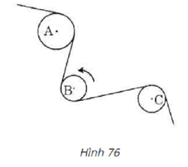 Đố. Dây cua-roa trên hình 76 có những phần là tiếp tuyến của các đường tròn tâm A, B, C. Chiều quay của đường tròn tâm B ngược chiều quay của kim đồng hồ. Tìm chiều quay của đường tròn tâm A và đường tròn tâm C (cùng chiều quay hay ngược chiều quay của kim đồng hồ).