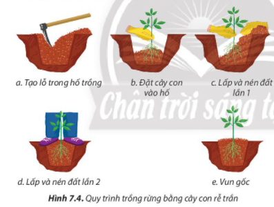 Câu hỏi 8. Quan sát hình 7.4, giải thích các thao tác kĩ thuật của phương pháp trồng rừng bằng cây con rễ trần.
