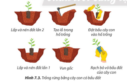 Câu hỏi 6. Quan sát Hình 7.3 và sắp xếp các công việc trồng rừng bằng cây con có bầu đất theo thứ tự thích hợp.