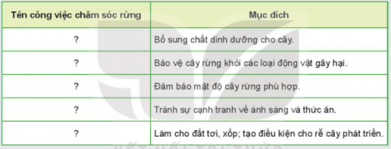 3. Hoàn thành vào vở tên công việc chăm sóc rừng theo mẫu bảng dưới đây: