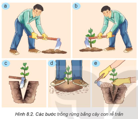 2. Hãy sắp xếp các ảnh trong Hình 8.2 theo thứ tự các bước trong quy trình trồng rừng bằng cây con rễ trần.