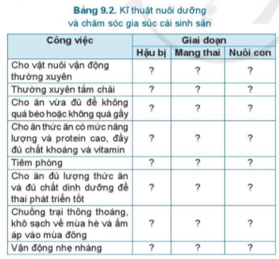 CH: Em hãy lựa chọn những công việc nuôi dưỡng, chăm sóc gia súc cái sinh sản thích hợp cho từng giai đoạn trong Bảng 9.2