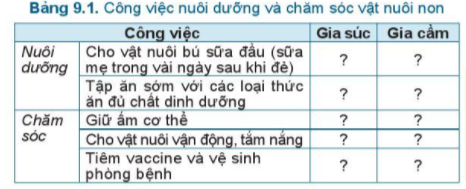 CH: Em hãy lựa chọn những công việc nuôi dưỡng và chăm sóc phù hợp cho gia súc, gia cầm non trong bảng 9.1.