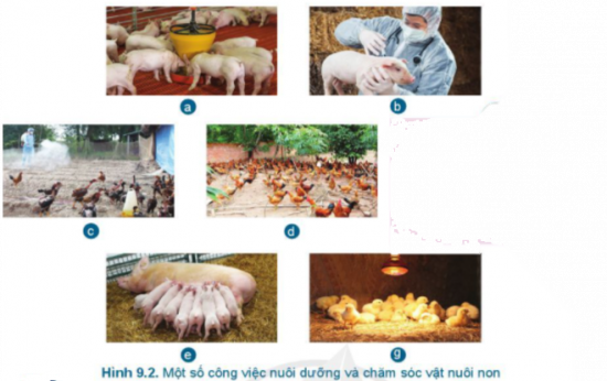 1. Em hãy nêu tên các công việc nuôi dưỡng và chăm sóc vật nuôi non trong Hình 9.2