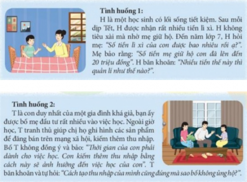 Câu 2. Em hãy đọc tình huống sau và tư vấn cho các bạn H và T cách quản lí tiền, tạo thu nhập phù hợp.
