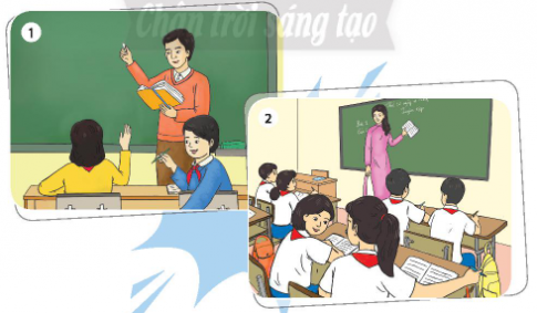1. Chỉ ra hành vi thể hiện sự hợp tác với thầy cô trong các bức tranh sau và giải thích sự lựa chọn của em.