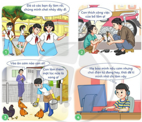 Tình huống 3: Hằng ngày, ngoài giờ học Tâm thường xuyên làm các công việc gia đình như rửa bát, dọn dẹp nhà cửa, tưới rau, cho gà ăn,... Ai cũng khen Tâm biết yêu quý lao động. Nhưng Lan lại nói với Tâm: “Là học sinh không nên mất thời gian làm