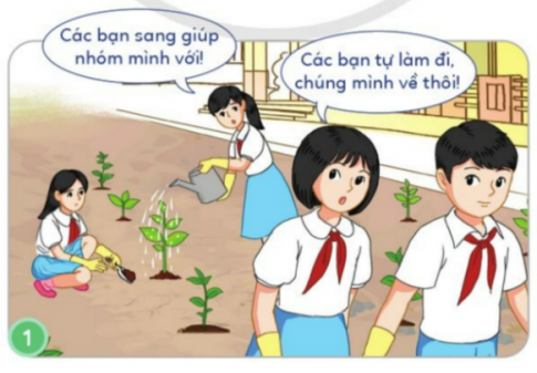 Tình huống 1: Đang phụ mẹ tưới cây ngoài sân, Hoàng thấy một cô lao công mồ hôi nhễ nhại đi tới và ngồi nghỉ trước cổng nhà mình. Hoàng liền xin phép mẹ đi lấy nước cho cô uống. Mẹ Hoàng rất vui vì thấy con mình biết quý trọng người lao động.