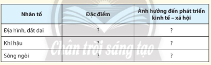 1. Hãy hoàn thành thông tin về ảnh hưởng của một số nhân tố tự nhiên và tài nguyên thiên nhiên đến phát triển kinh tế - xã hội khu vực Đông Nam Á theo bảng sau: