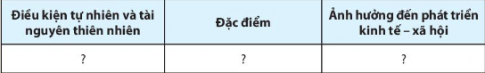 1. Lựa chọn một điều kiện tự nhiên hoặc tài nguyên thiên nhiên và hoàn thành thông tin theo bảng sau: