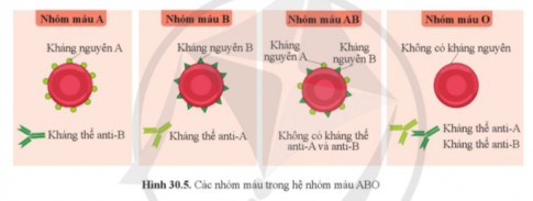 Câu hỏi 3. Quan sát hình 30.5 và cho biết tên các loại kháng nguyên kháng thể ở mỗi nhóm máu A, B, AB và O.
