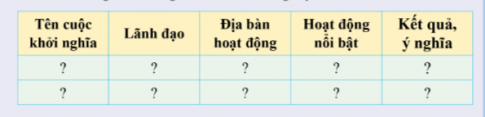 Câu hỏi 2: Lập bảng hệ thống kiến thức về các cuộc khởi nghĩa tiêu biểu trong phong trào Cần vương và khởi nghĩa Yên Thế theo nội dung sau: