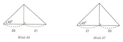 Cho tam giác có một góc bằng $45^{\circ}$. Đường cao chia một cạnh kề với góc đó thành các phần 20cm và 21cm. Tính cạnh lớn trong hai cạnh còn lại ( lưu ý có hai trường hợp hình 46 và hình 47).