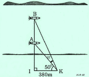 Hai chiếc thuyền A và B ở vị trí được minh họa như trong hình 48. Tính khoảng cách giữa chúng (làm tròn đến mét) .