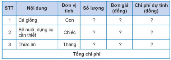 6. Hoa dự định nuôi một bể cá vàng khoảng 10 con. Biết rằng, giá mỗi con cá vàng là 15 000 đồng, tiền mua bể và các dụng cụ cần thiết là 60 000 đồng, tiền vàng là 15 000 đồng, tiền mua bể và các dụng cụ cần thiết là 60 000 đòng, tiền mua thức ăn là 30 000 đồng/tháng. Em hãy giúp bạn Hoa tính toán chi phí cần thiết để nuôi 10 con cá vàng trong 6 tháng đầu theo mẫu bảng dưới đây.