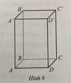 Bài 4: Cho hình hộp chữ nhật ABCD.A'B'C'D' (Hình 8). Diện tích của các mặt ABCD, BB'C'C VÀ CC'D'D lần lượt là 2 cm$^{2}$, 6cm$^{2}$, 3 cm$^{2}$. Tính thể tích hình hộp chữ nhật ABCD.A'B'C'D'