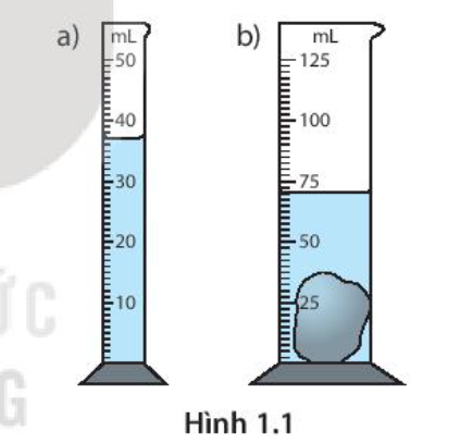 1.8. Trong Hình 1.1, ban đầu bình a chứa nước, bình b chứa một vật rắn không thấm nước. Khi đổ hết nước từ bình a sang bình b thì mức nước trong bình b được vẽ trong hình. Thể tích của vật rắn là